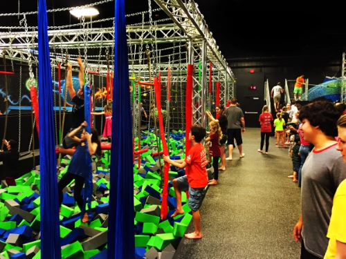 Еще одна зона притяжения – батутный парк площадью 650 кв. м. Чего здесь только нет. Парк включает в себя зону для игры в баскетбол, волейбол; спортивные и любительские батуты; две ямы с поролоновыми кубиками – одна для взрослых посетителей и одна с горкой для детей; «Ниндзя-курс» с препятствиями; большую воздушную подушку, на которую так же можно прыгать.
