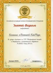 Вот уже несколько лет подряд компания Brunswick/KidsPlay получает дипломы за креативный дизайн и награждается почетными медалями от организаторов выставки за разработку лучшей выставочной экспозиции. Нынешний 2012 год не стал исключением – мы получили ЗОЛОТУЮ МЕДАЛЬ за создание лучшей экспозиции на XIV Международной выставке «Аттракционы и развлекательное оборудование РАППА Экспо - 2012».