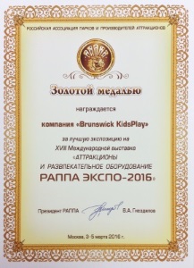 Вот уже несколько лет подряд компания Brunswick/KidsPlay получает дипломы за креативный дизайн и награждается почетными медалями от организаторов выставки. 2016 год не стал исключением – мы получили золотую мкдаль за создание лучшей экспозиции на XVIII Международной выставке «Аттракционы и развлекательное оборудование РАППА Экспо-2016».